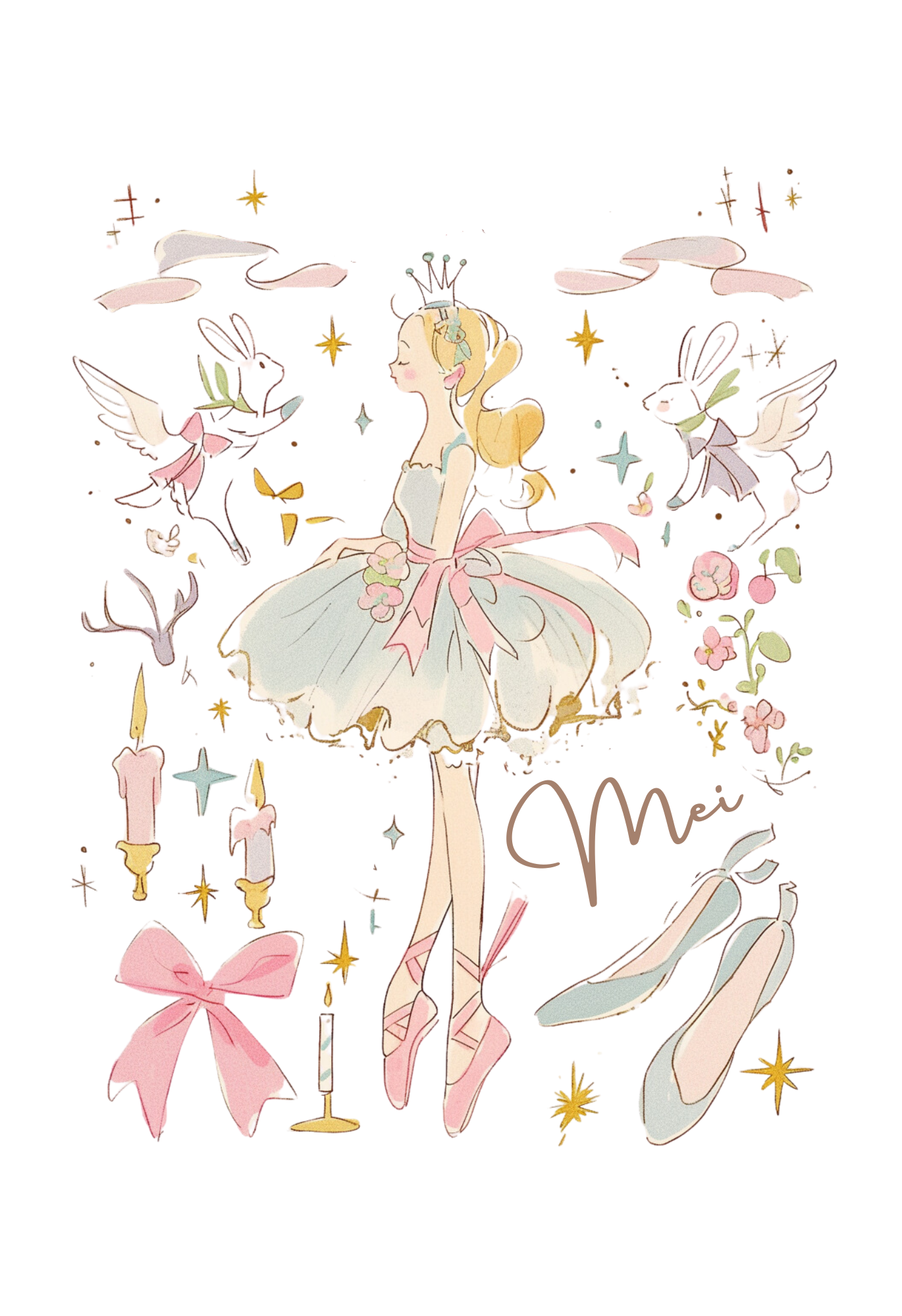 デザインには、夢見るバレリーナや可愛いリボン、トゥシューズが描かれており、キラキラと輝く世界観を楽しんでいただけます。